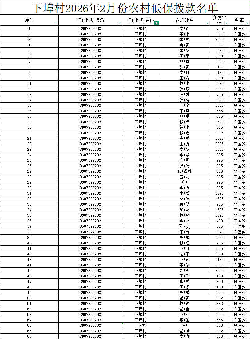 【社會救助】下埠村2026年2月份農村低保撥款名單公示