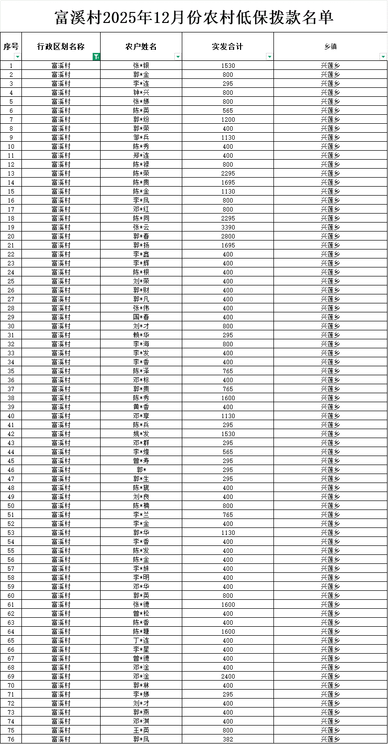 【社會救助】富溪村2025年12月份農(nóng)村低保撥款名單