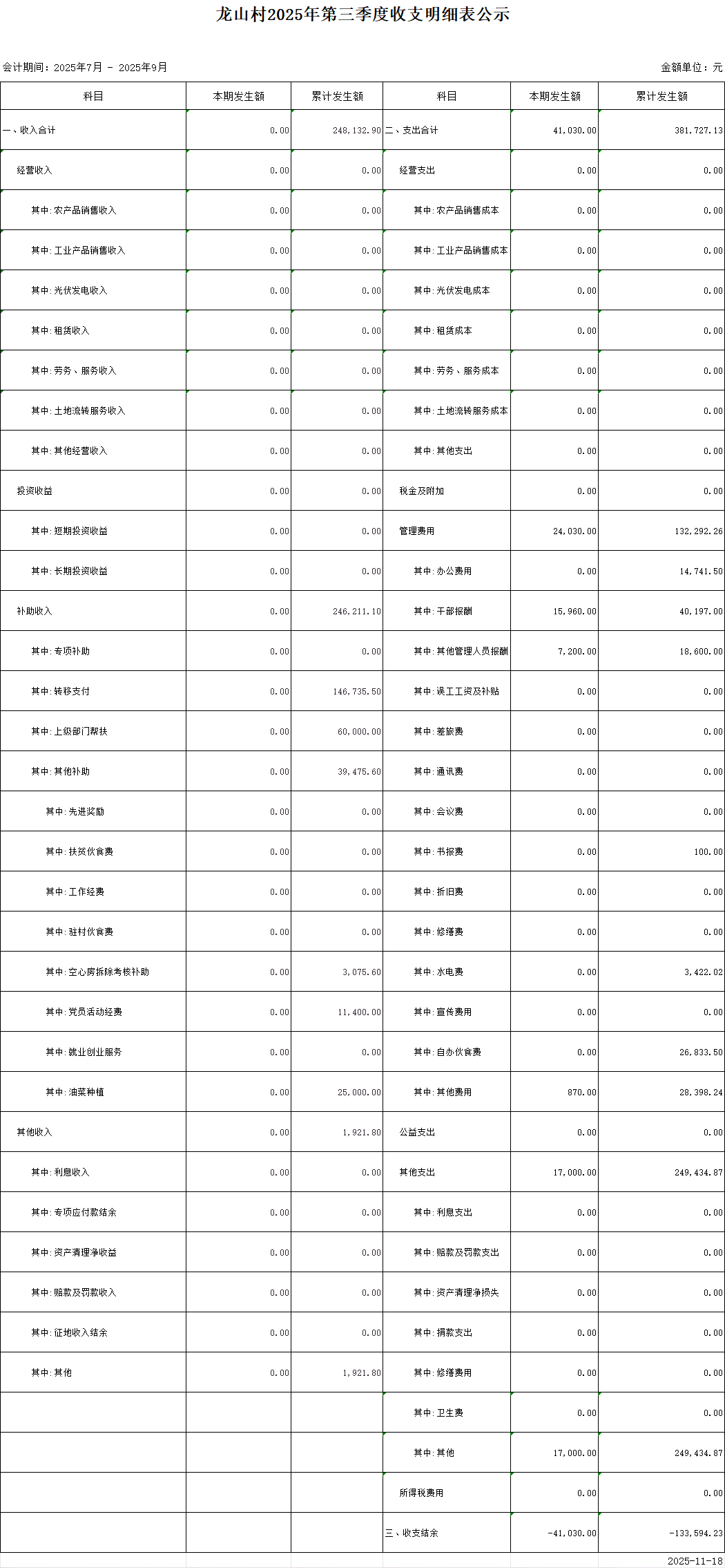龍山村2025年第三季度收支明細表公示