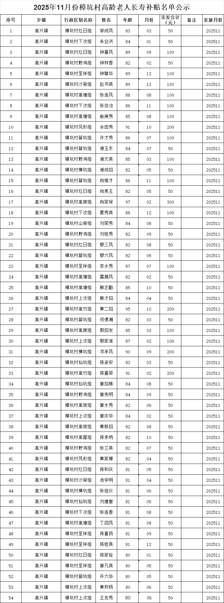 2025年11月份樟坑村高齡老人長壽補貼名單公示