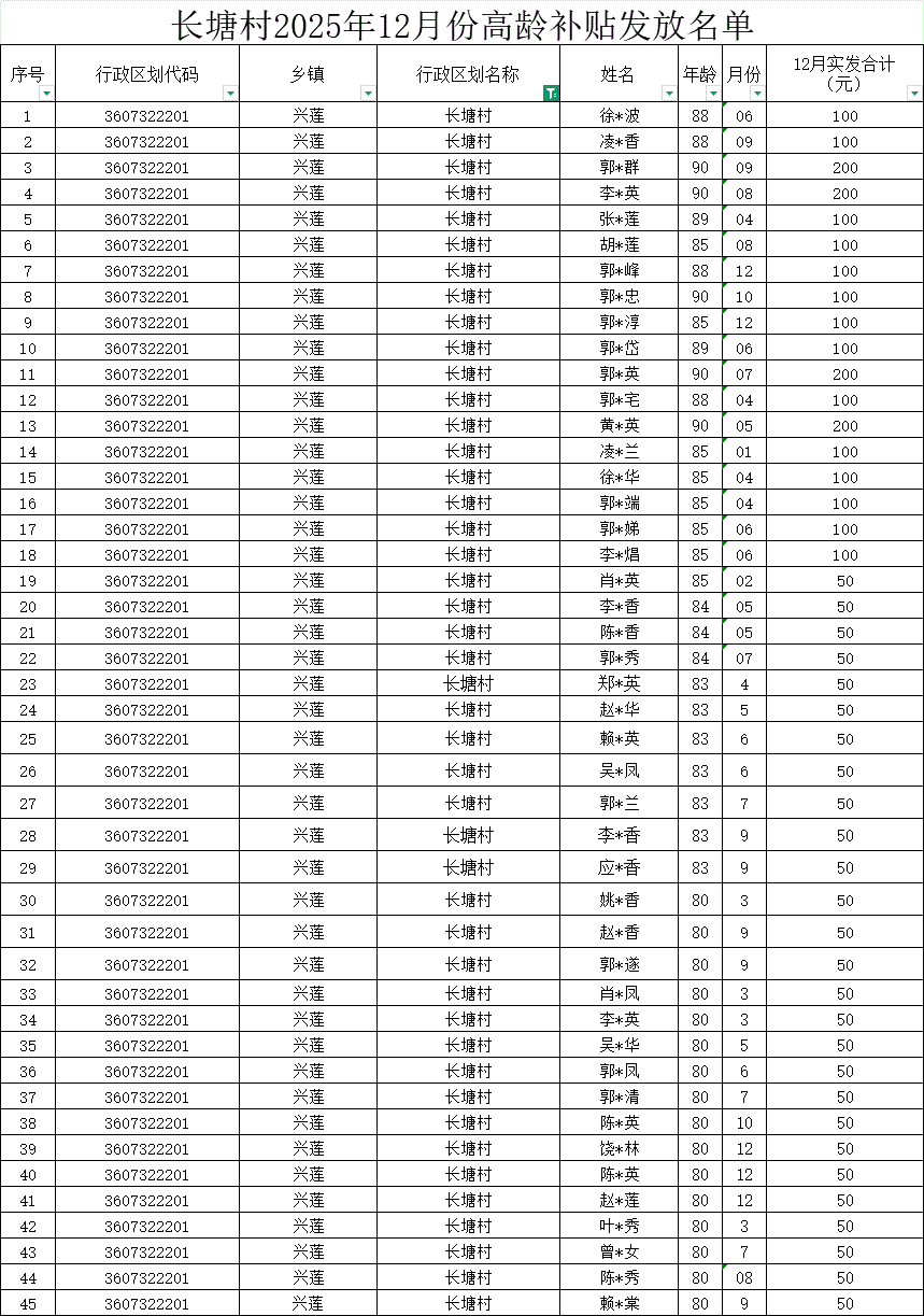 【養老服務】長塘村2025年12月份高齡補貼發放名單