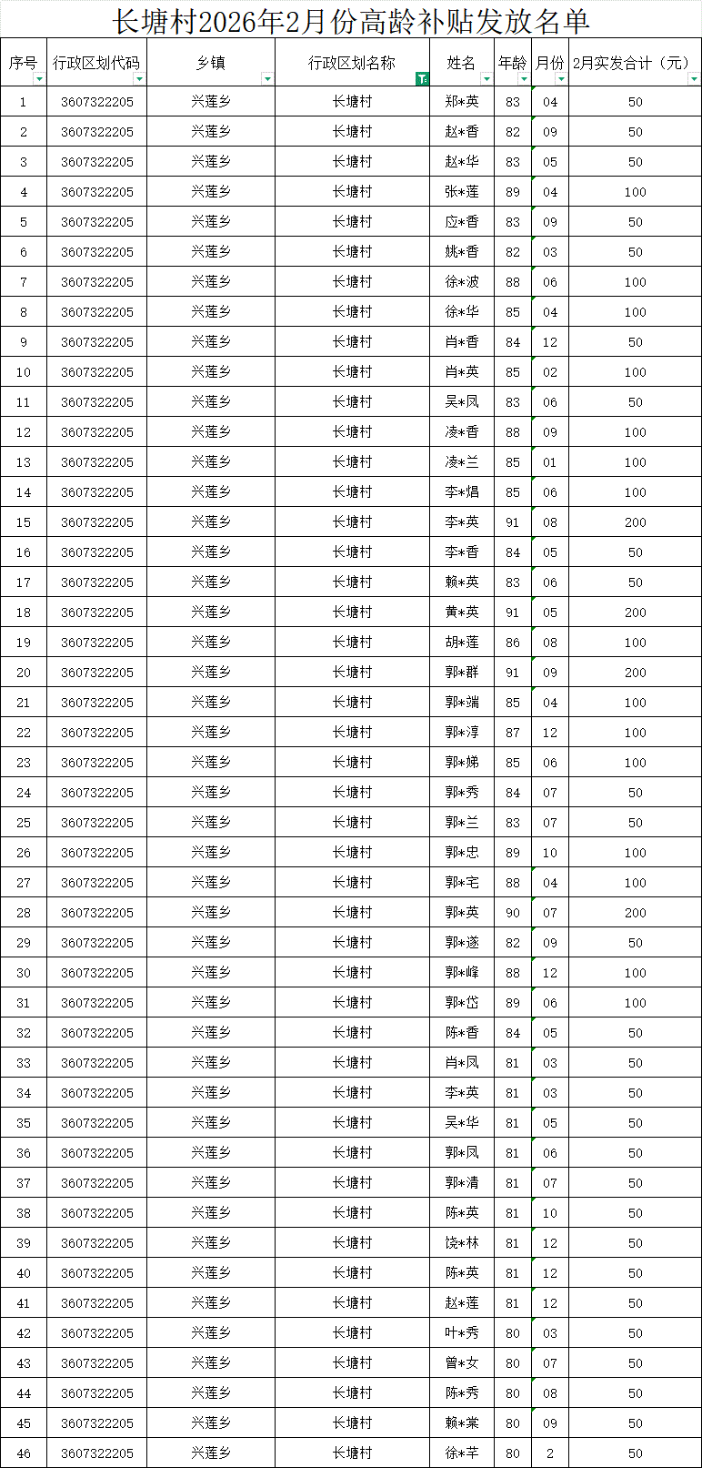 【養老服務】長塘村2026年2月份高齡補貼發放名單