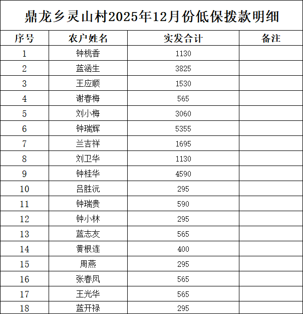 鼎龍鄉靈山村2025年12月份低保公示名單