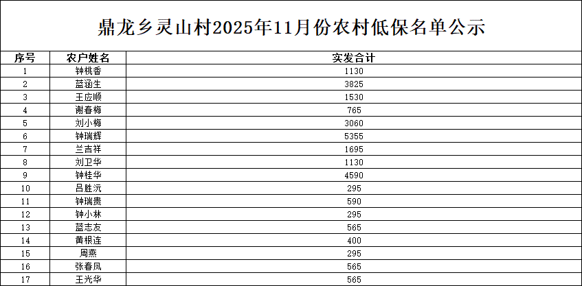 靈山村2025年11月份農村低保名單公示