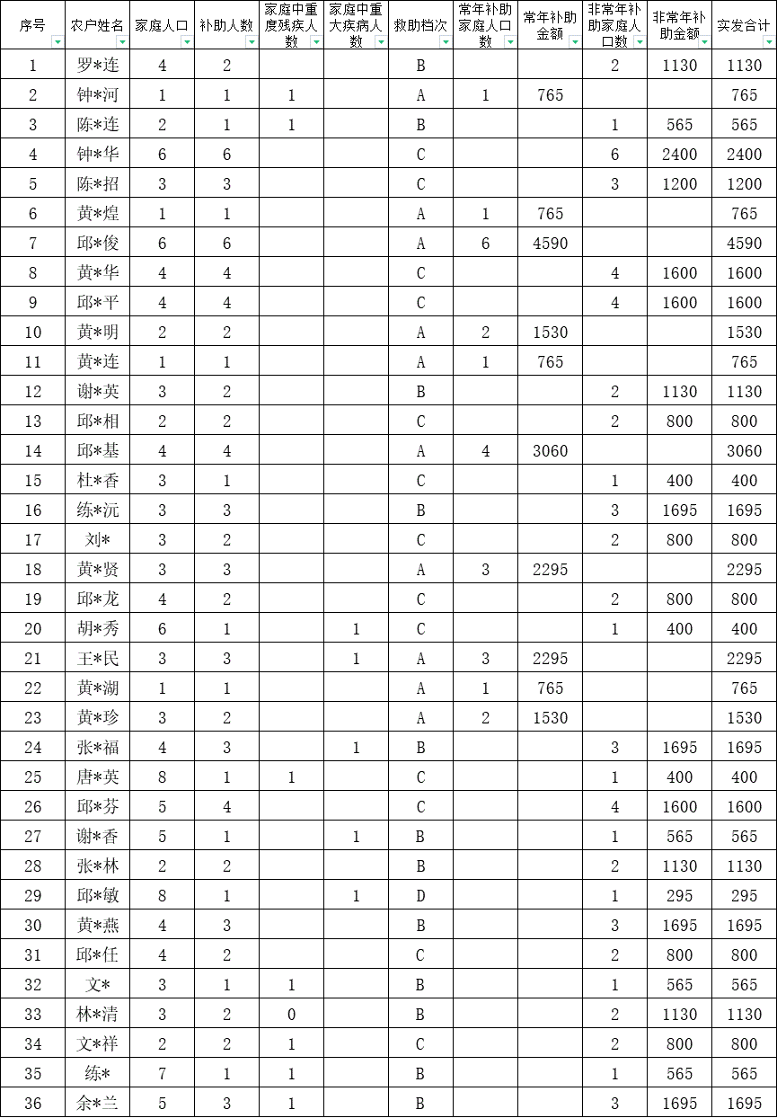 龍下村2025年12月份農村低保上報名單