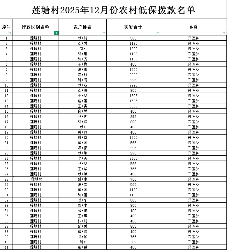 【社會救助】蓮塘村2025年12月份農村低保撥款名單公示