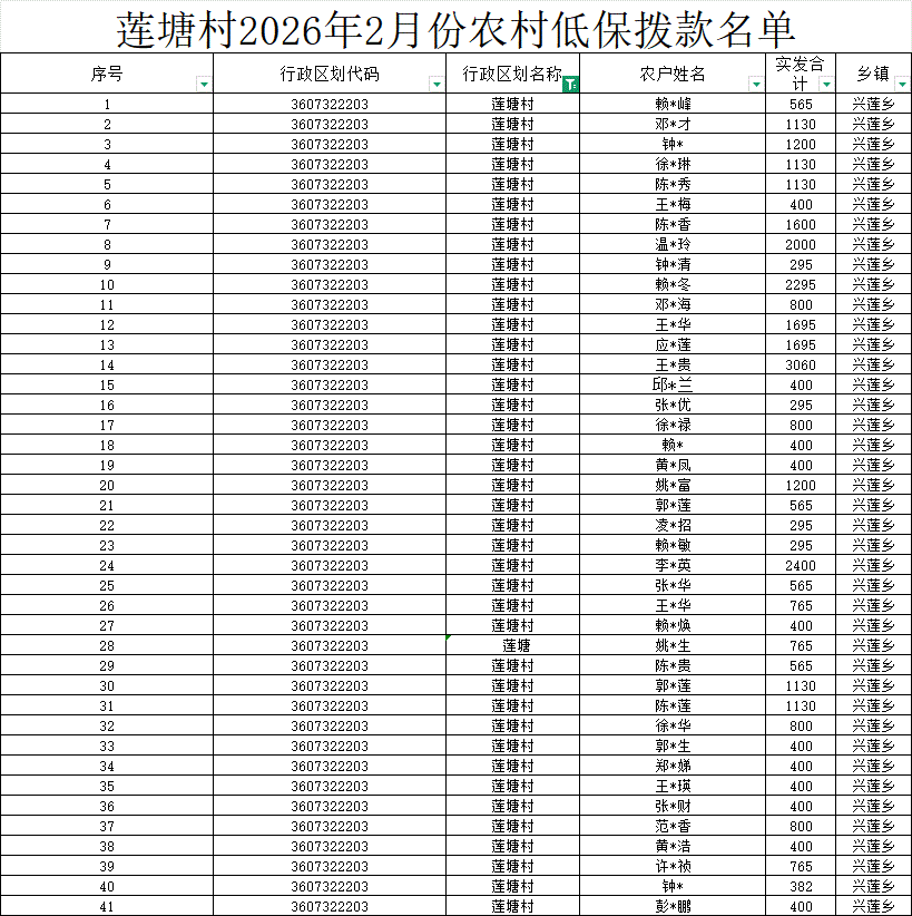 【社會救助】蓮塘村2026年2月份農村低保撥款名單