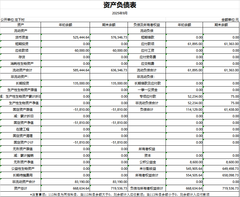 龍下村9月份資產負債表