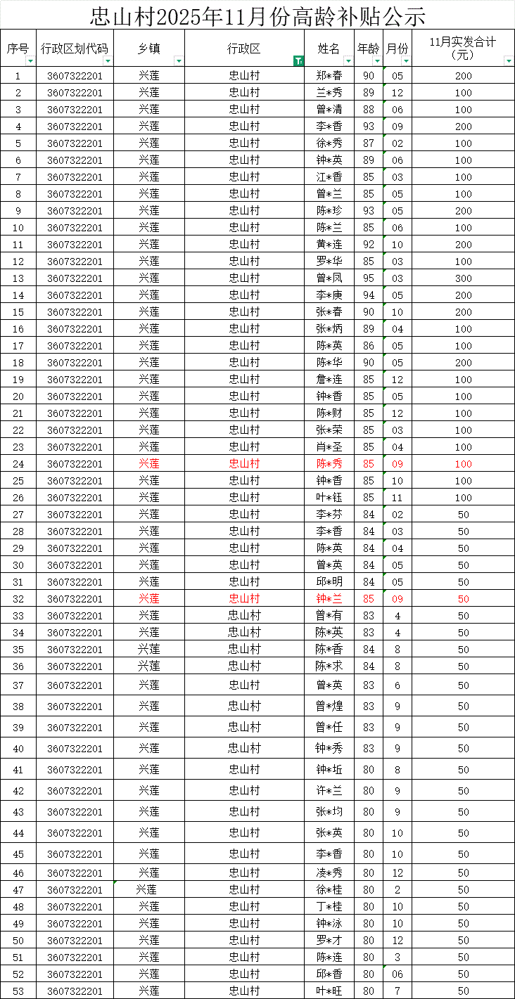 【養老服務】忠山村2025年11月份高齡補貼公示