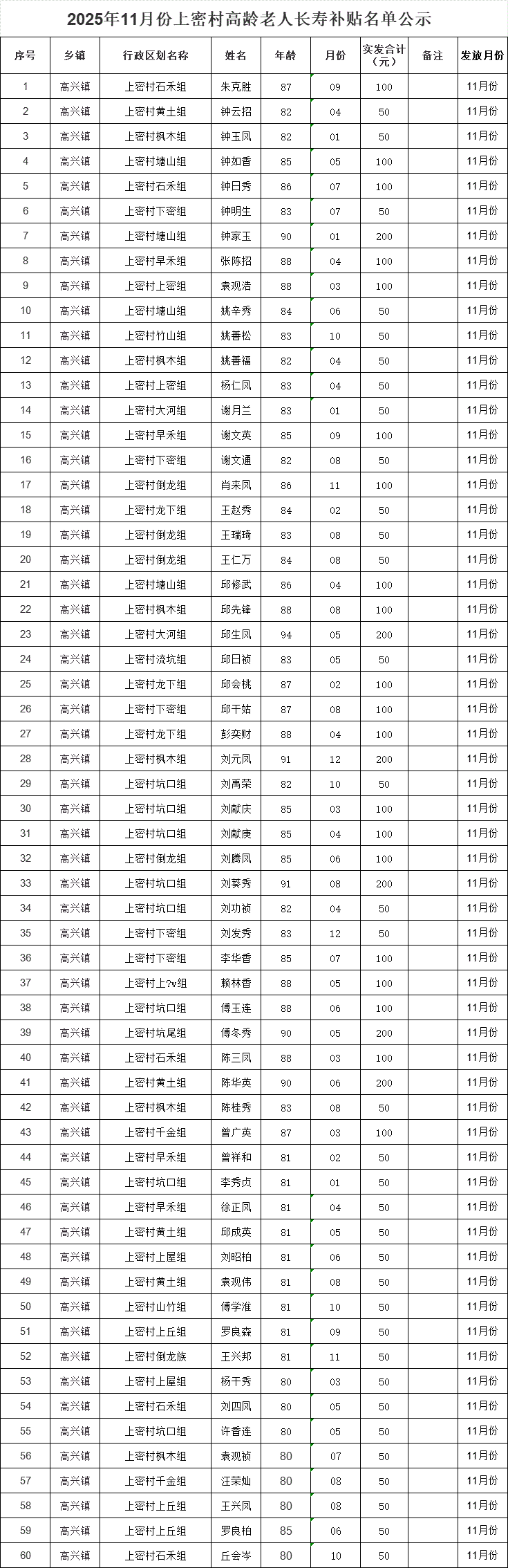 2025年11月份上密村高齡老人長(zhǎng)壽補(bǔ)貼名單公示?