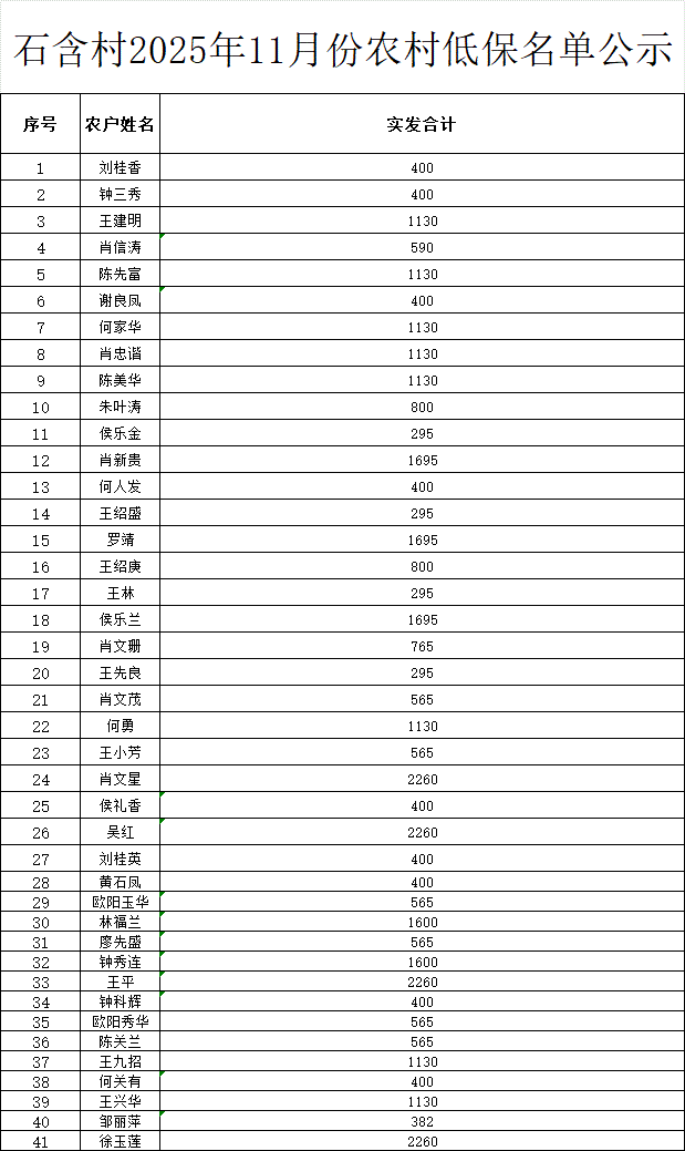 石含村2025年11月份農村低保名單公示
