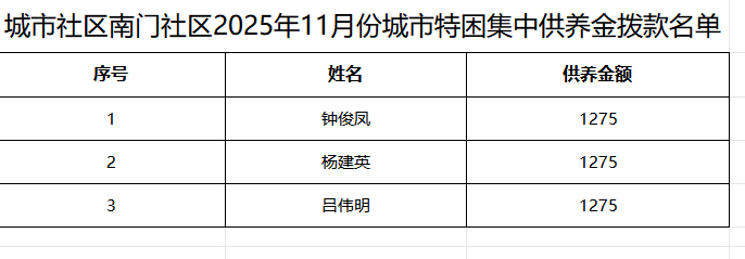 城市社區(qū)南門(mén)社區(qū)2025年11月份城市特困集中供養(yǎng)金撥款名單