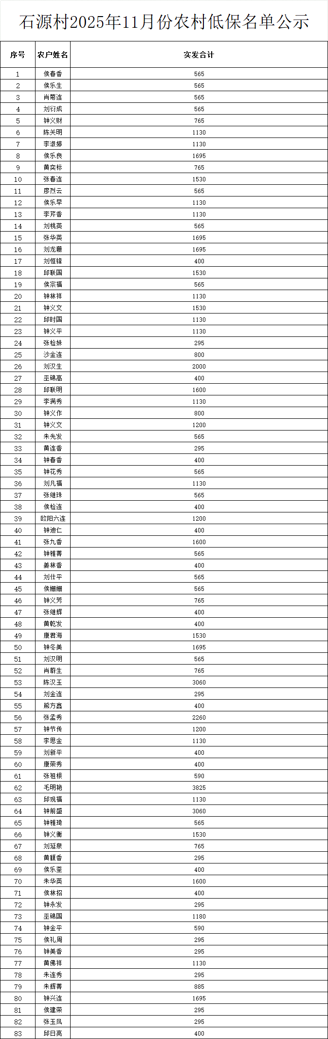 石源村2025年11月份農村低保名單公示