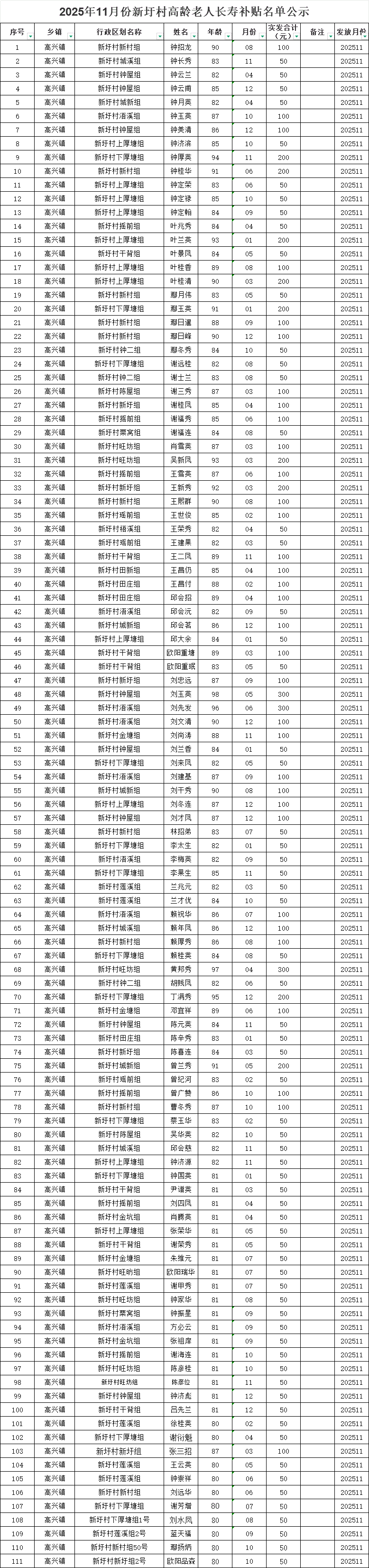 2025年11月份新圩村高齡老人長壽補貼名單公示