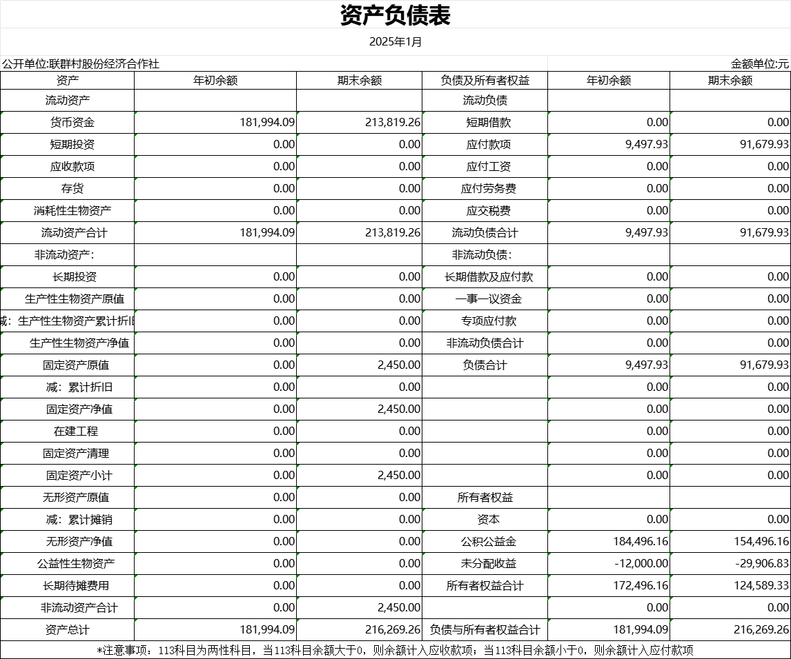 聯群村股份經濟合作社2025年1月份資產負債表公示