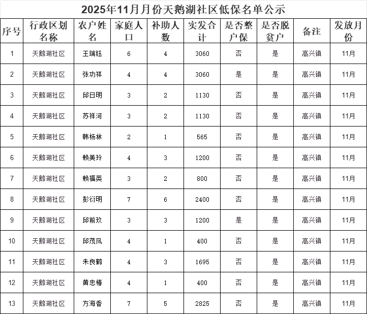 2025年11月月份天鵝湖社區低保名單公示