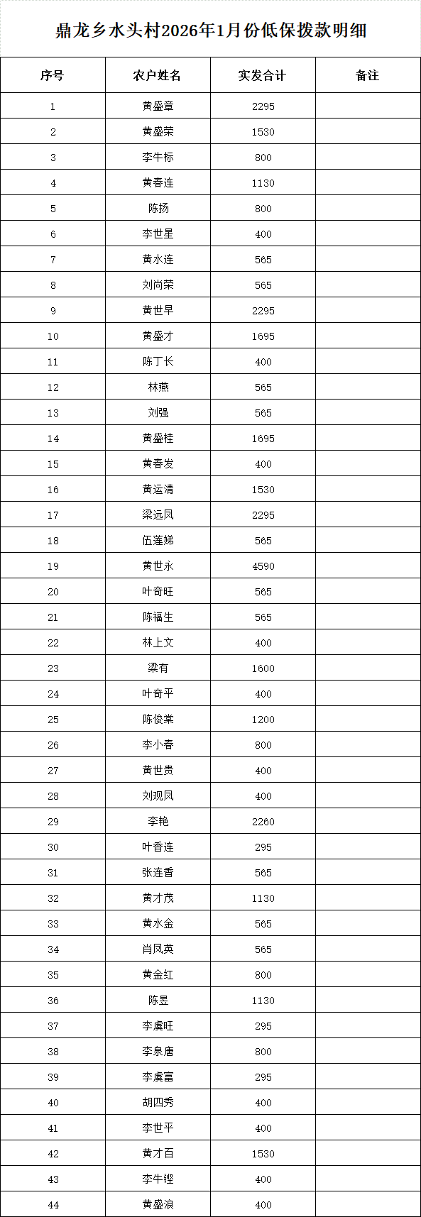 鼎龍鄉(xiāng)水頭村2026年1月份低保撥款明細(xì)