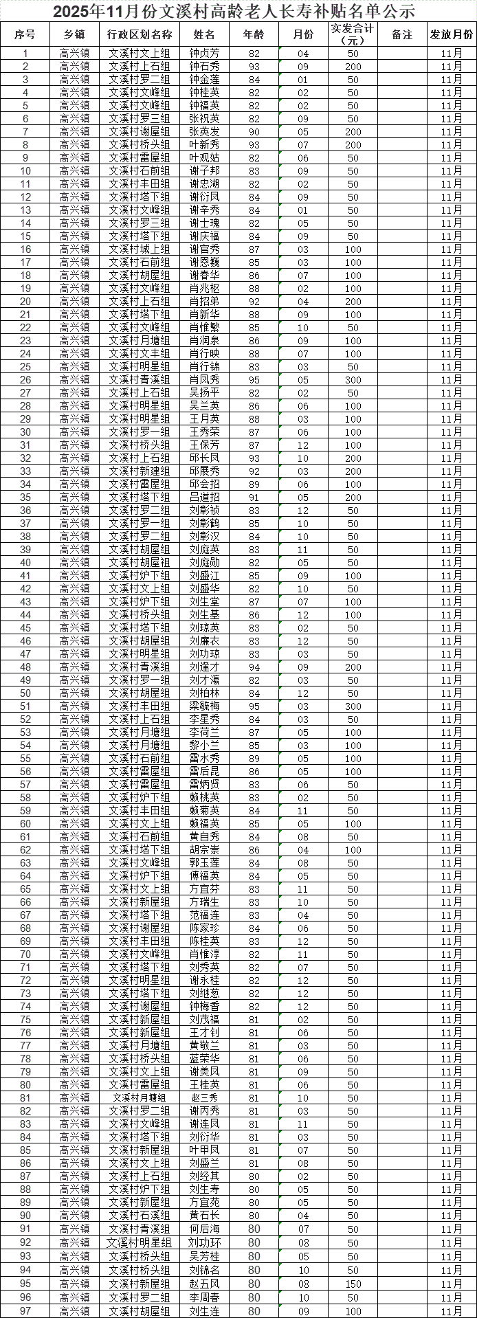 2025年11月份文溪村高齡老人長壽補貼名單公示?