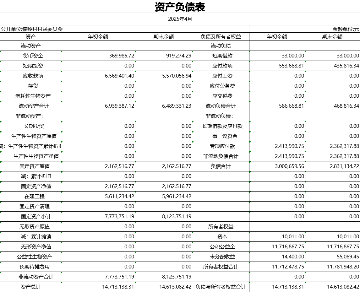貓嶺村2025年4月資產負債表公示