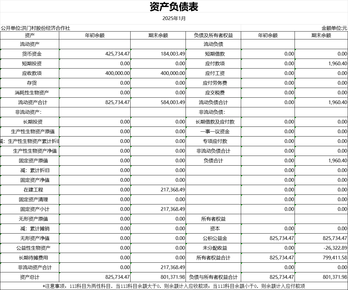 洪門村股份經(jīng)濟合作社2025年1月資產(chǎn)負債表公示