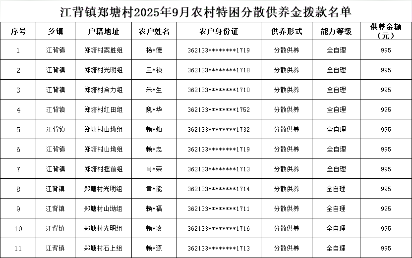 【社會救助】江背鎮鄭塘村2025年9月農村特困分散供養金撥款名單
