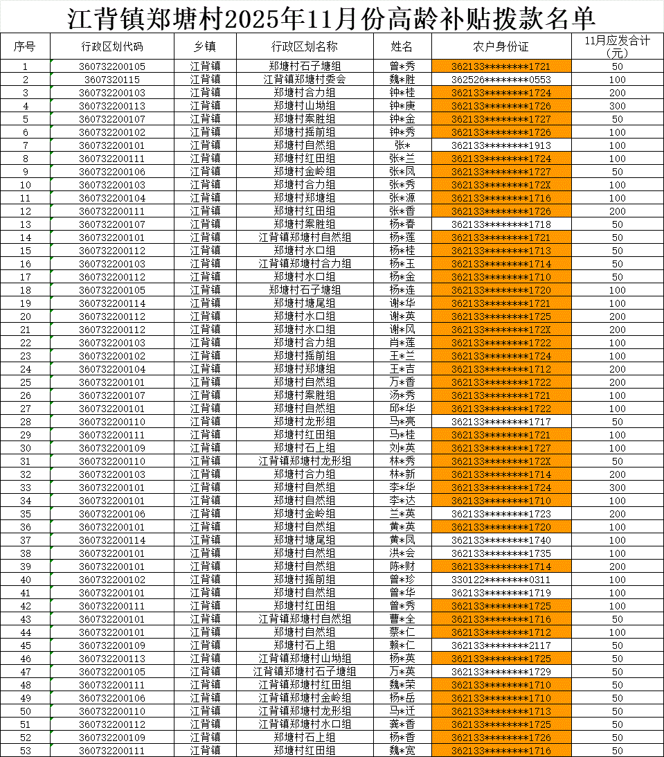 【養老服務】江背鎮鄭塘村2025年11月份高齡補貼撥款名單