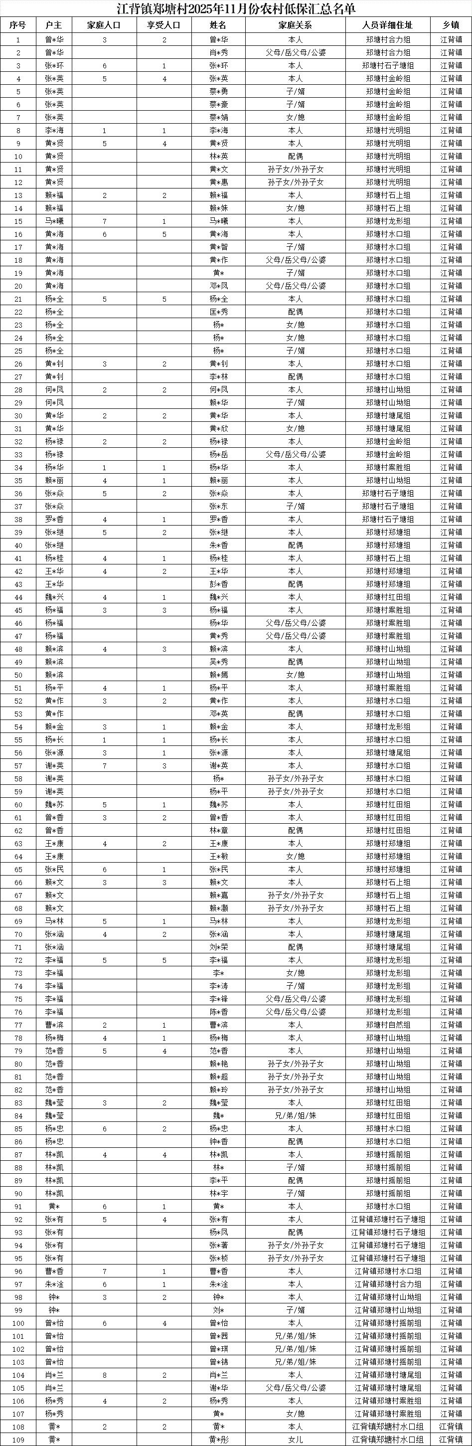 【社會救助】江背鎮鄭塘村2025年11月份農村低保匯總名單
