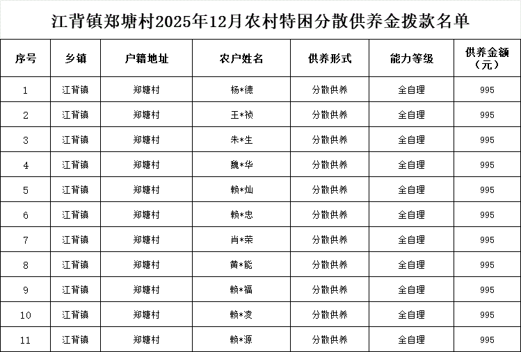 【社會救助】江背鎮鄭塘村2025年12月農村特困分散供養金撥款名單