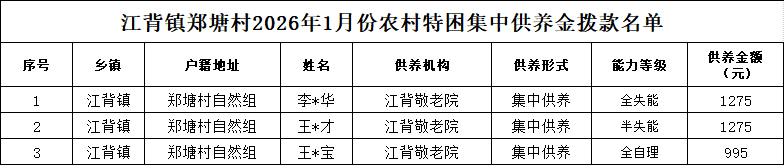 【社會救助】江背鎮鄭塘村2026年1月份農村特困集中供養金撥款名單