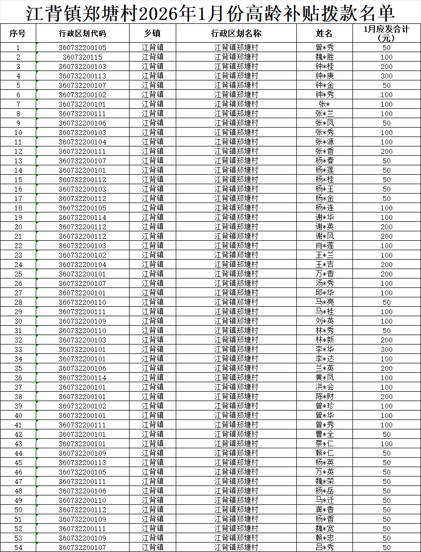 【養(yǎng)老服務】江背鎮(zhèn)鄭塘村2026年1月份高齡補貼撥款名單