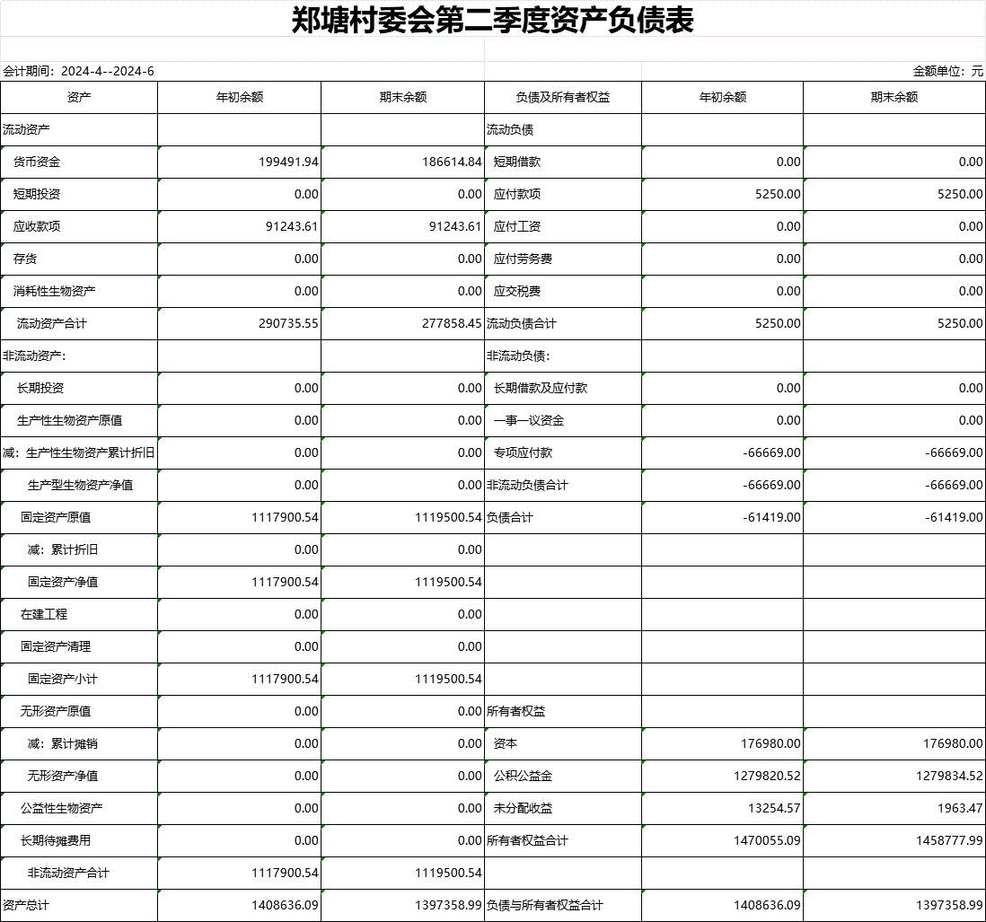 【財(cái)務(wù)收支】鄭塘村2024年第二季度資產(chǎn)負(fù)債表公示