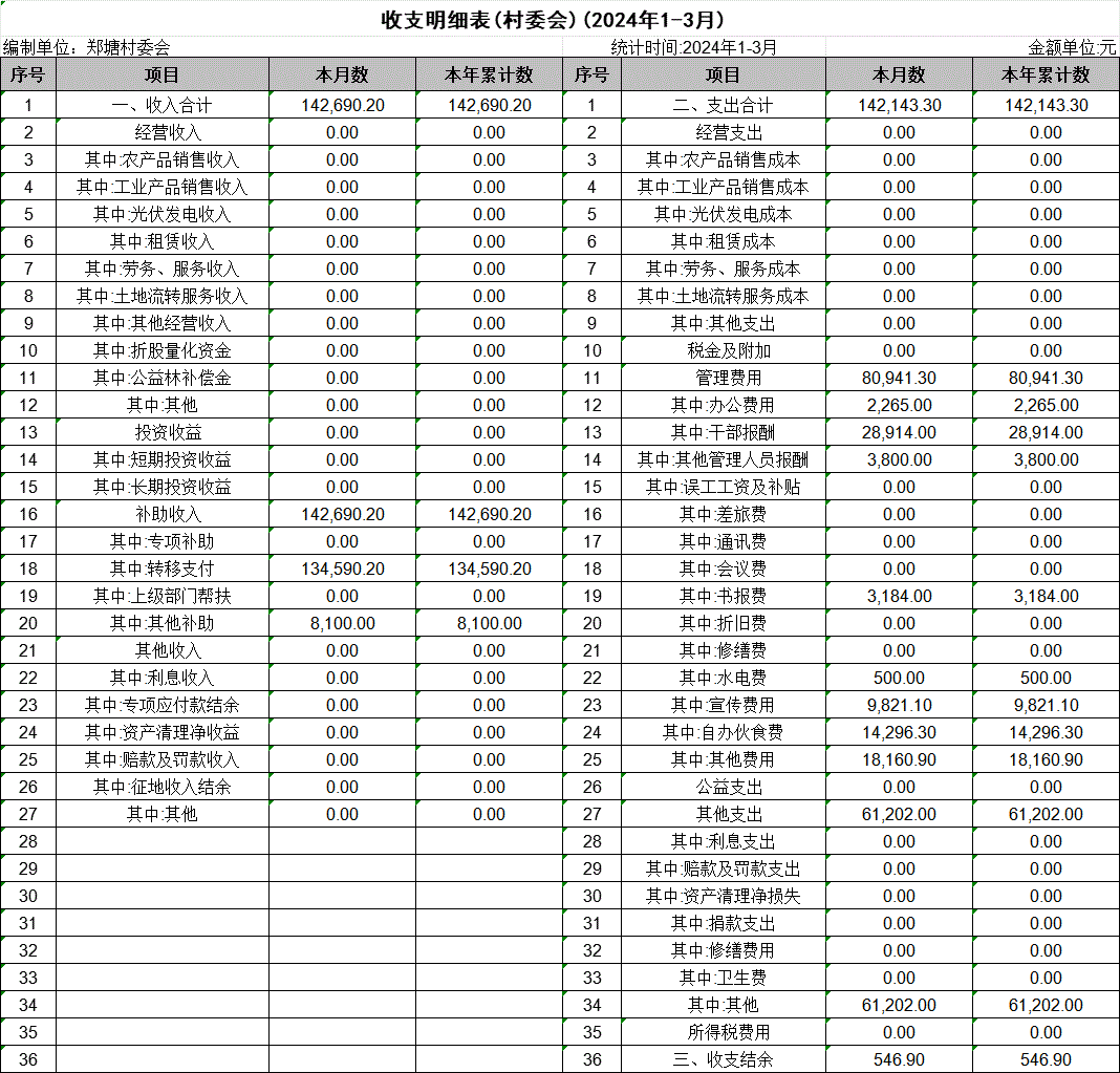 【財(cái)務(wù)收支】鄭塘村2024年第一季度收支明細(xì)表公示