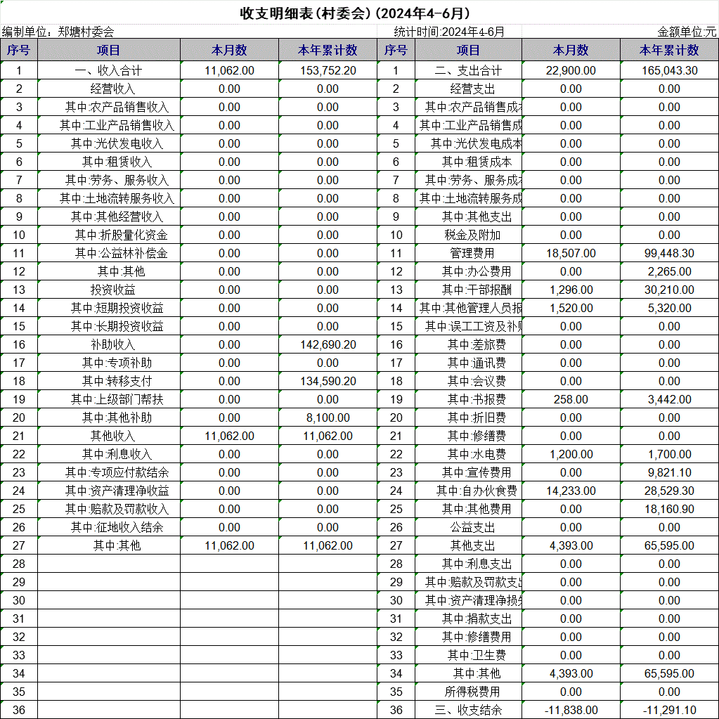 【財務收支】鄭塘村2024年第二季度收支明細表公示