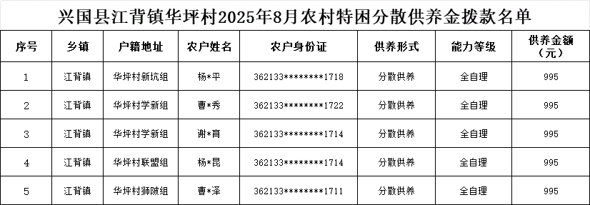 【社會救助】江背鎮華坪村2025年8月農村特困分散供養金撥款名單