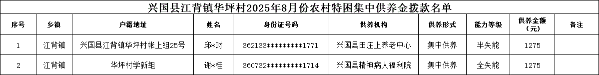 【社會救助】江背鎮華坪村2025年8月份農村特困集中供養金撥款名單