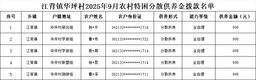 【社會救助】江背鎮華坪村2025年9月農村特困分散供養金撥款名單