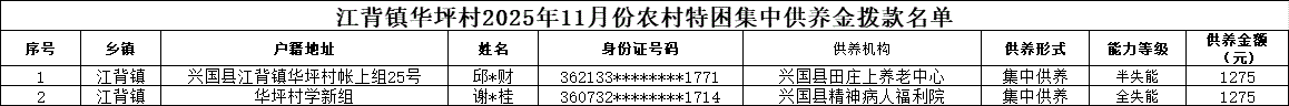 【社會救助】江背鎮華坪村2025年11月份農村特困集中供養金撥款名單