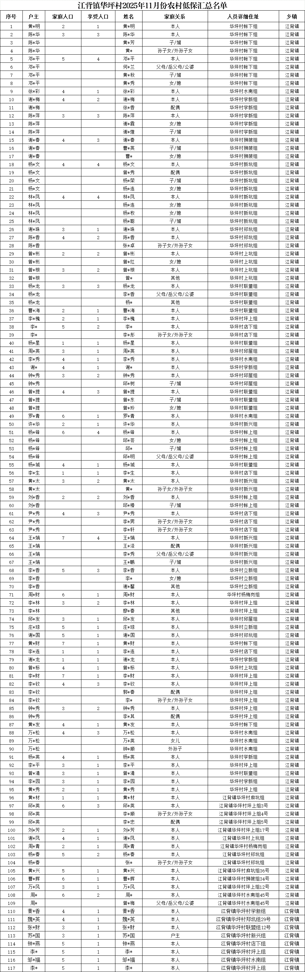 【社會救助】江背鎮華坪村2025年11月份農村低保匯總名單