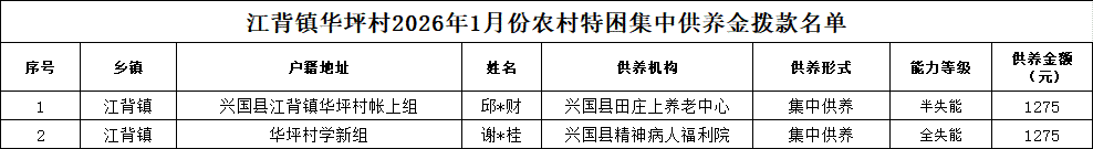【社會救助】江背鎮華坪村2026年1月份農村特困集中供養金撥款名單
