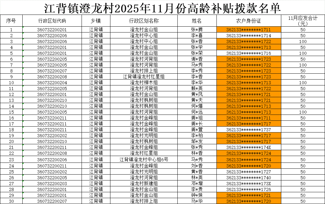 【養(yǎng)老服務】江背鎮(zhèn)澄龍村2025年11月份高齡補貼撥款名單