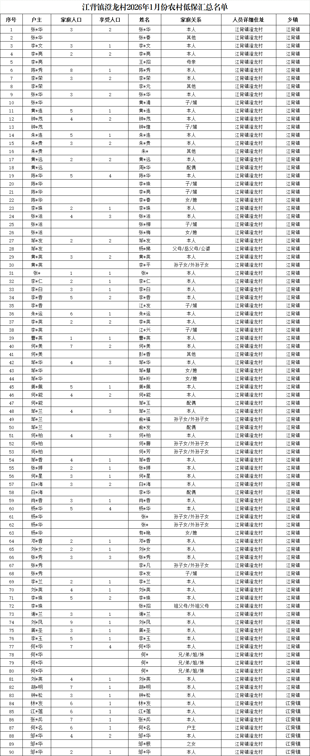 【社會救助】江背鎮澄龍村2026年1月份農村低保匯總名單