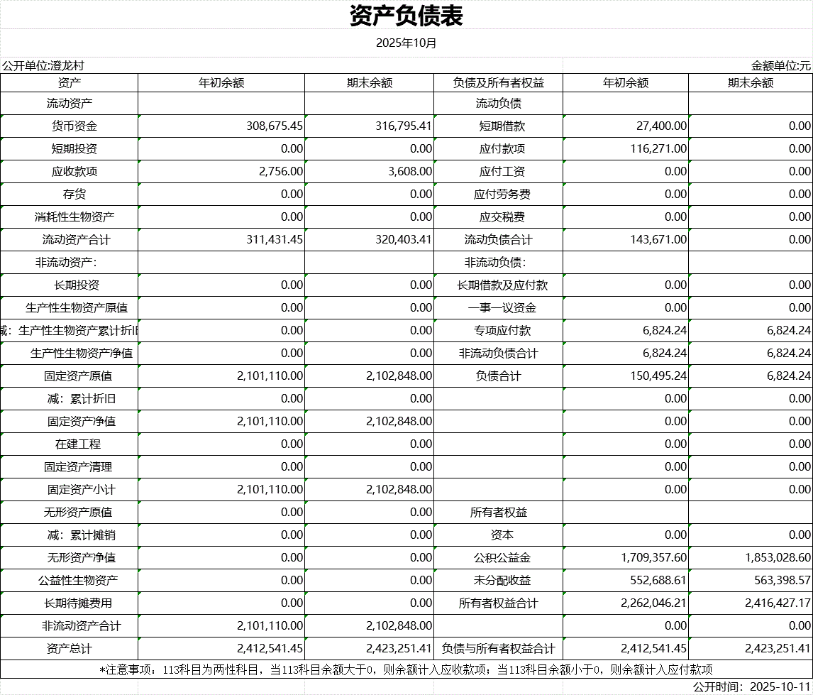 【財務收支】澄龍村2025年第三季度資產負債表公示
