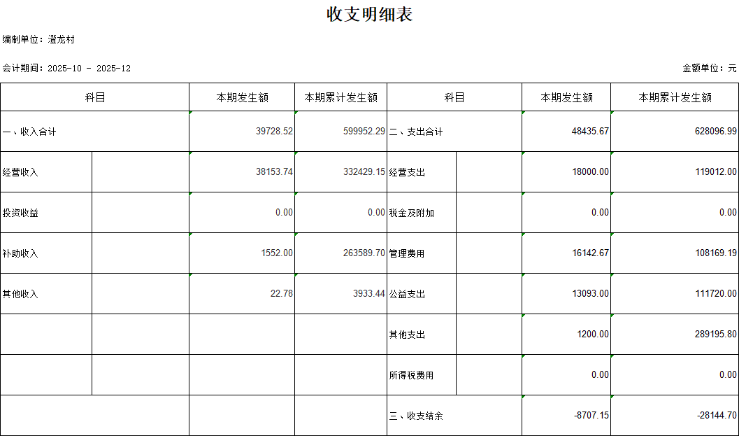 【財務收支】澄龍村2025年第四季度收支明細表公示