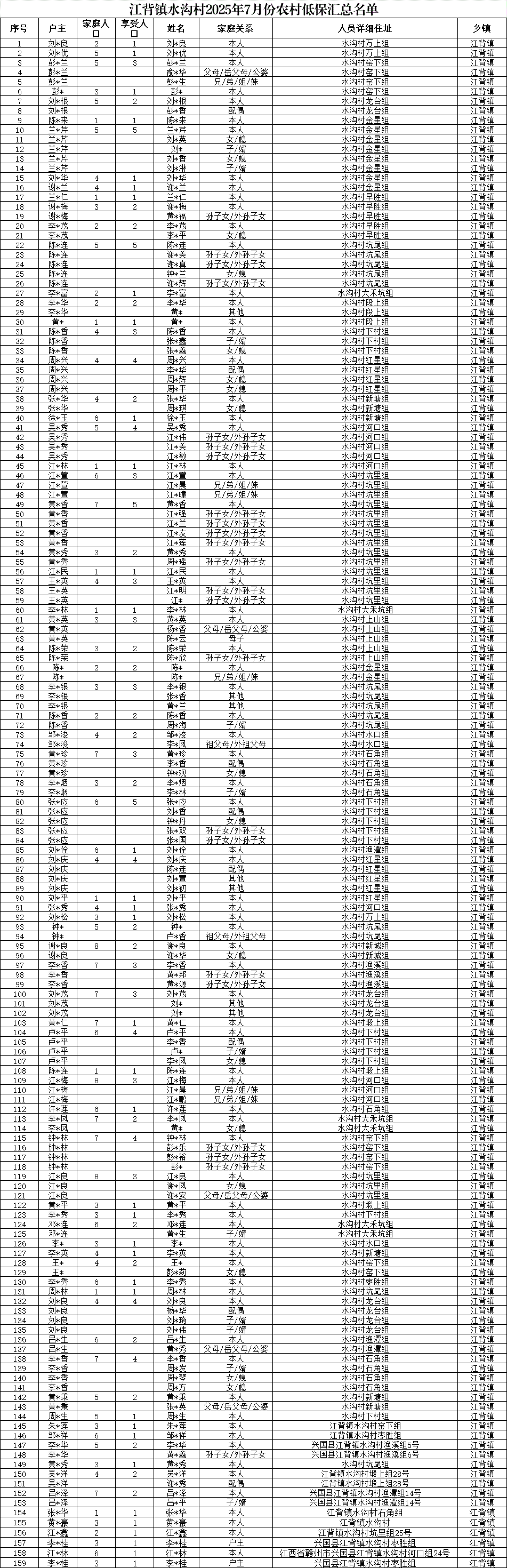 【社會救助】江背鎮(zhèn)水溝村2025年7月份農(nóng)村低保匯總名單