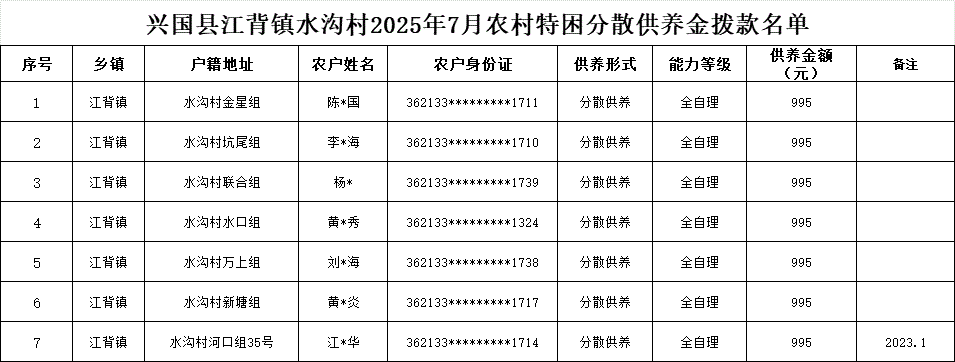 【社會救助】興國縣江背鎮水溝村2025年7月農村特困分散供養金撥款名單
