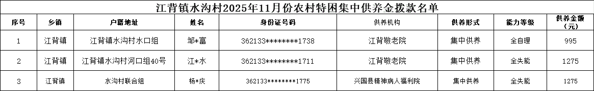 【社會救助】江背鎮水溝村2025年11月份農村特困集中供養金撥款名單