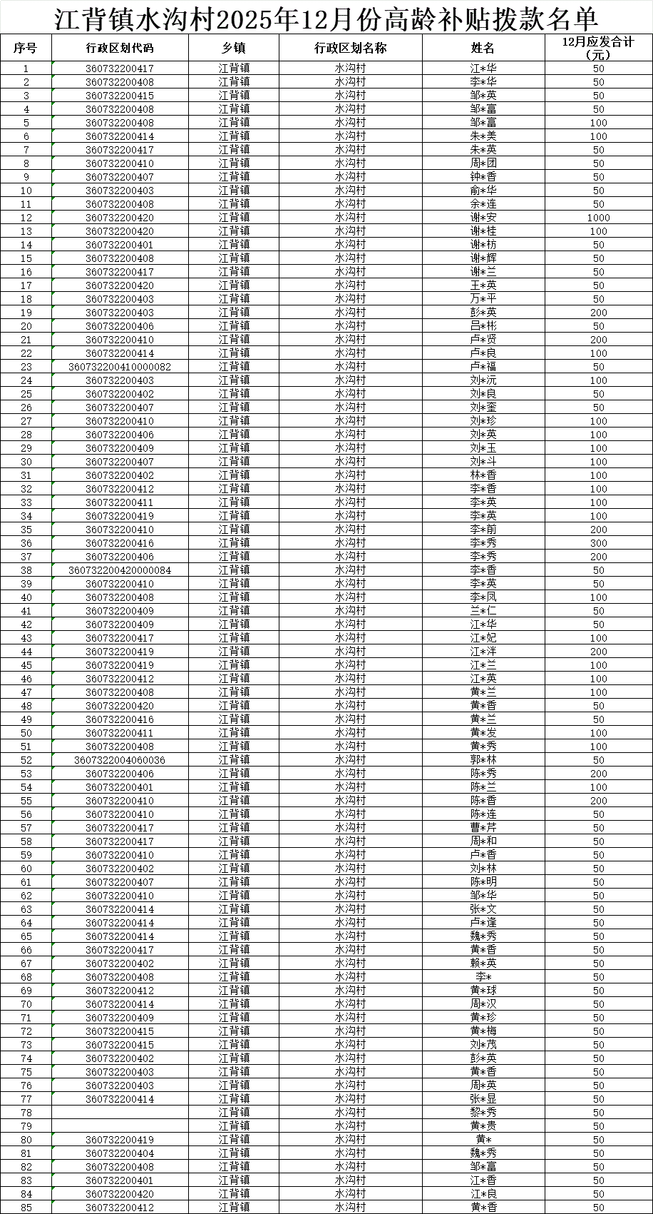 【養(yǎng)老服務(wù)】江背鎮(zhèn)水溝村2025年12月份高齡補(bǔ)貼撥款名單