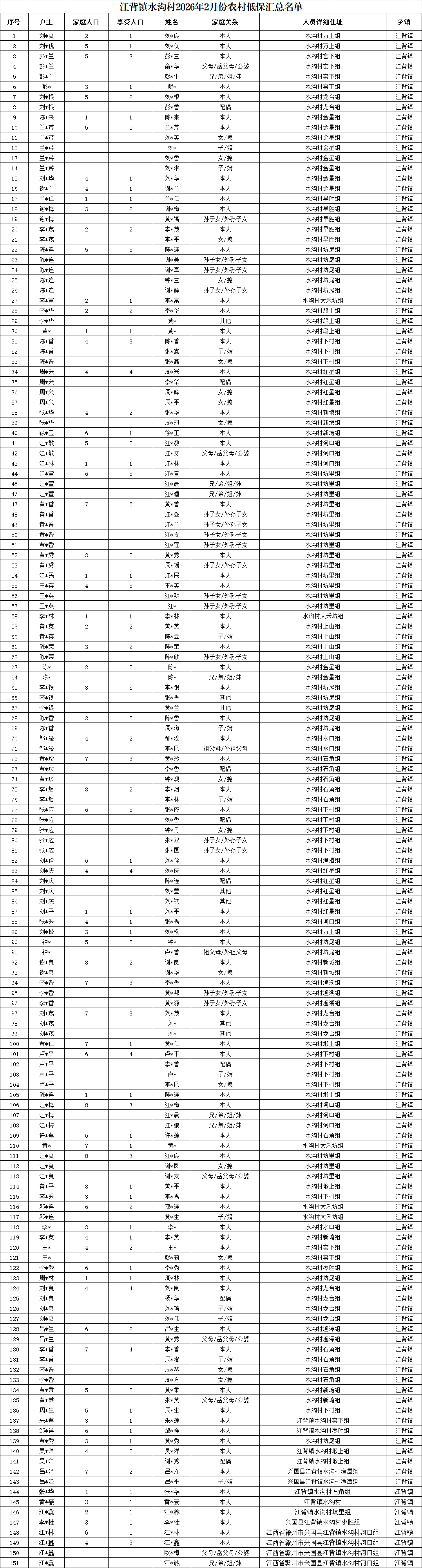 【社會救助】江背鎮水溝村2026年2月份農村低保匯總名單