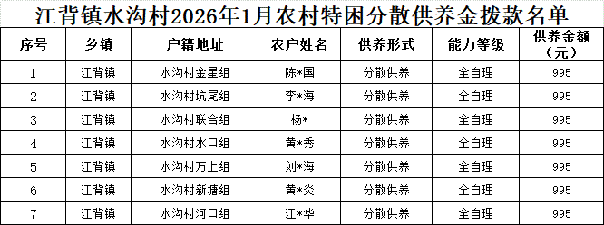 【社會救助】江背鎮水溝村2026年1月農村特困分散供養金撥款名單