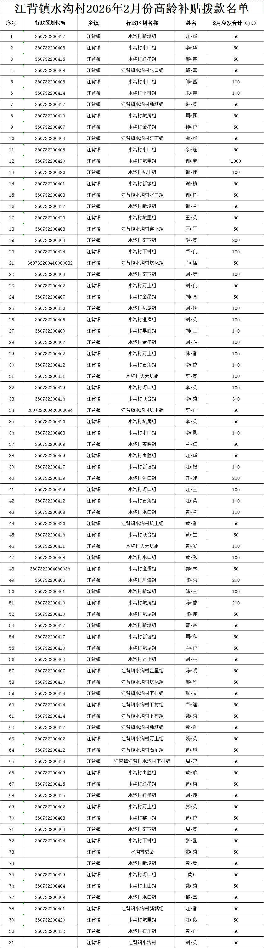 【養(yǎng)老服務(wù)】江背鎮(zhèn)水溝村2026年2月份高齡補(bǔ)貼撥款名單